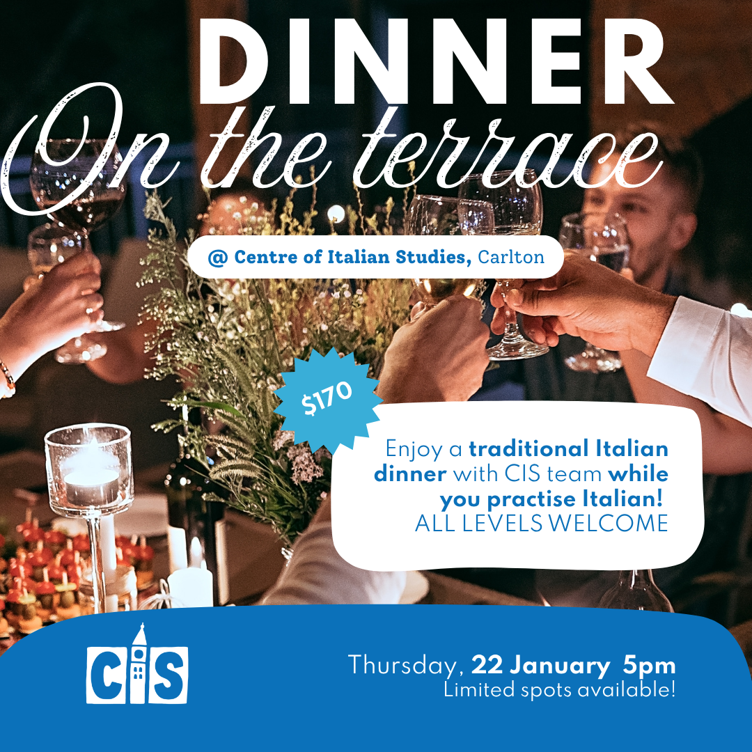 Join the CIS team for an evening of fun at the Centre of Italian Studies (245 Cardigan Street, Carlton VIC 3053). Enjoy an Italian buffet on the terrace with views of the Melbourne skyline, accompanied by live music and games.