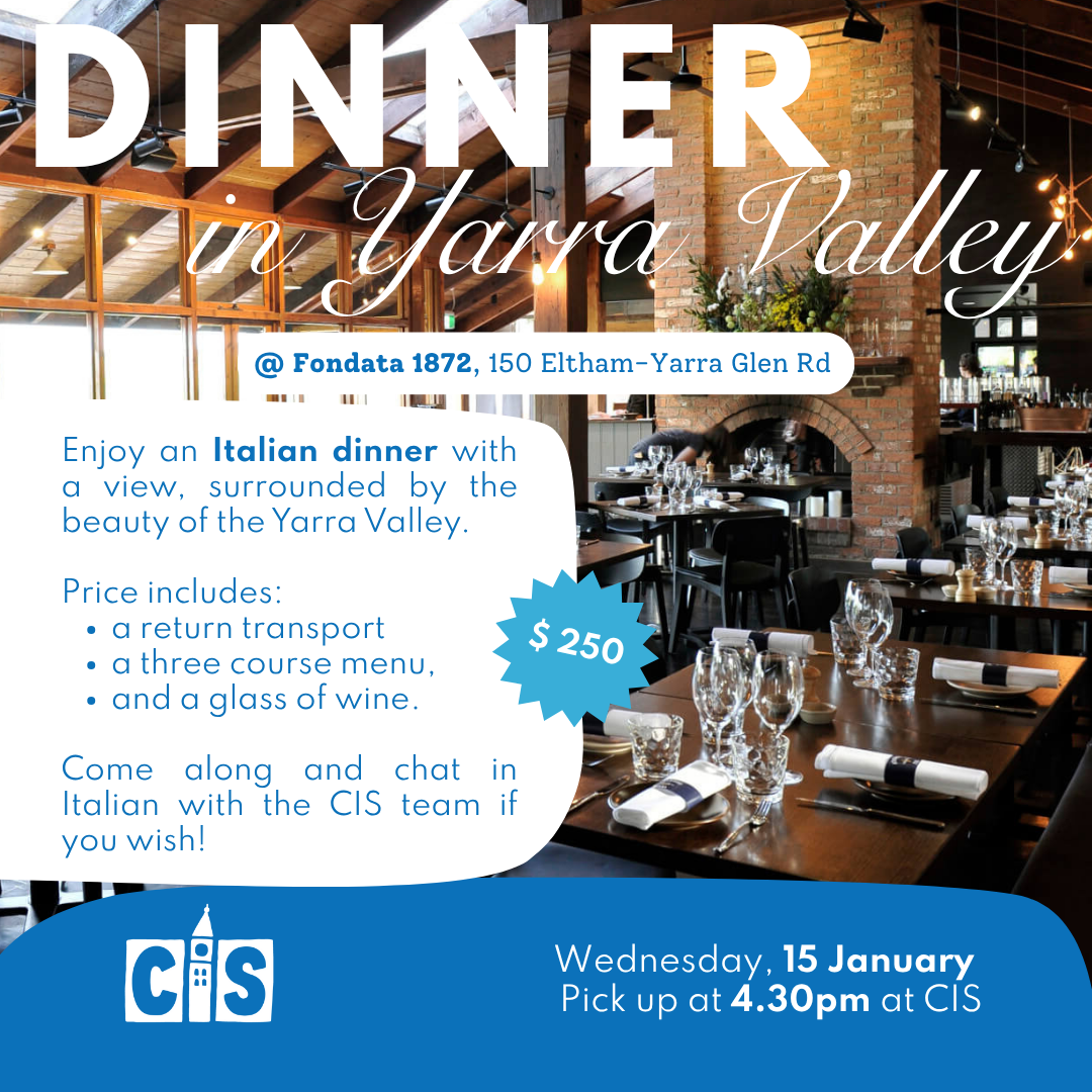 Thursday, 15 January – Dinner @ Fondata 1872, departure from CIS at 4.30pm ($250, Price includes a return transport, a three course menu, and a glass of wine)